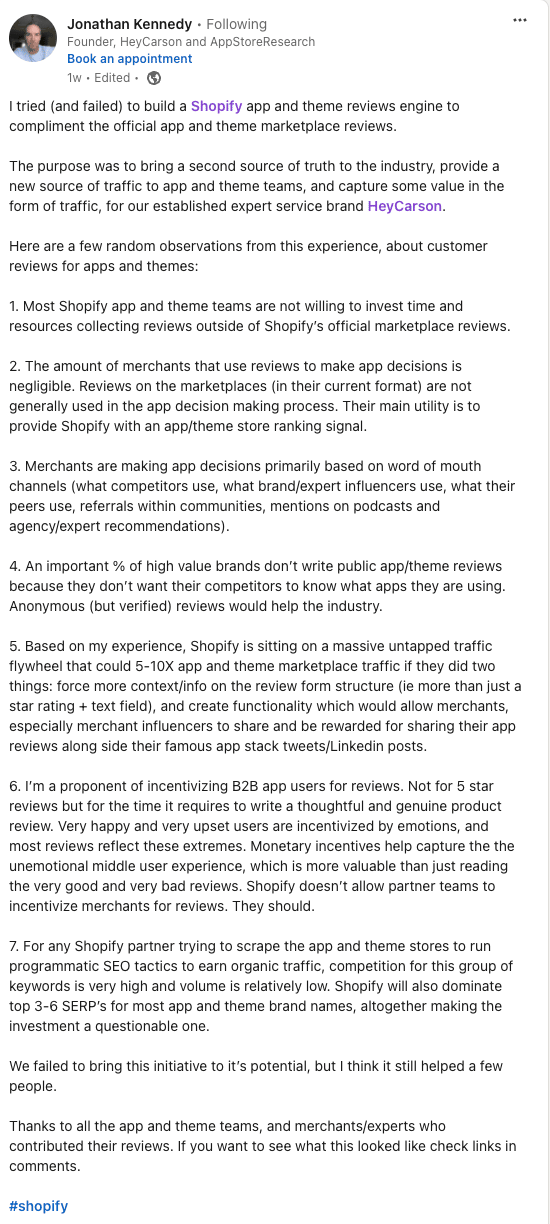 Jonathan Kennedy, the founder of HeyCarson- a review platform for Shopify apps and themes - shares his insights on customer reviews, offering a different perspective on reviews.