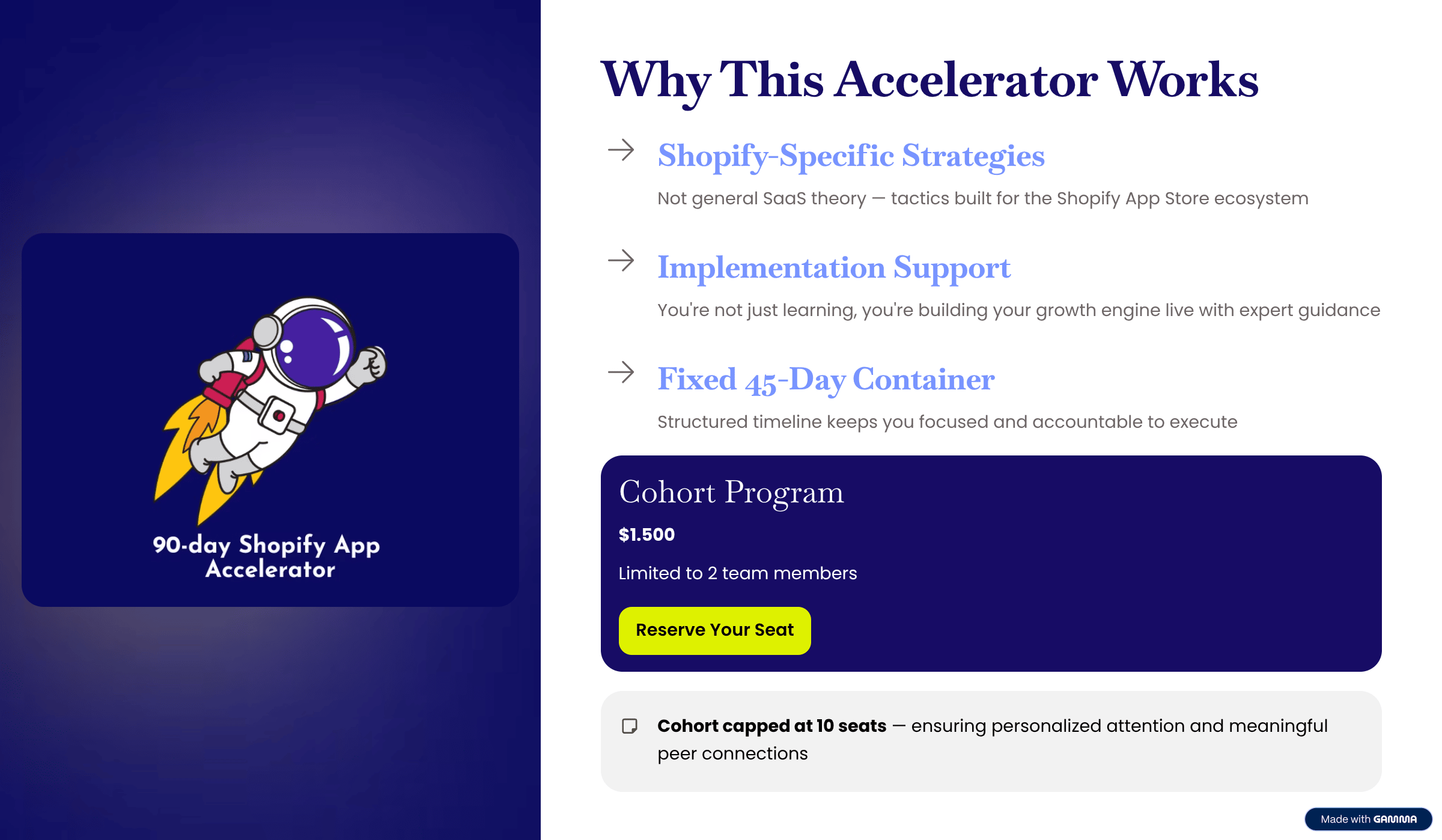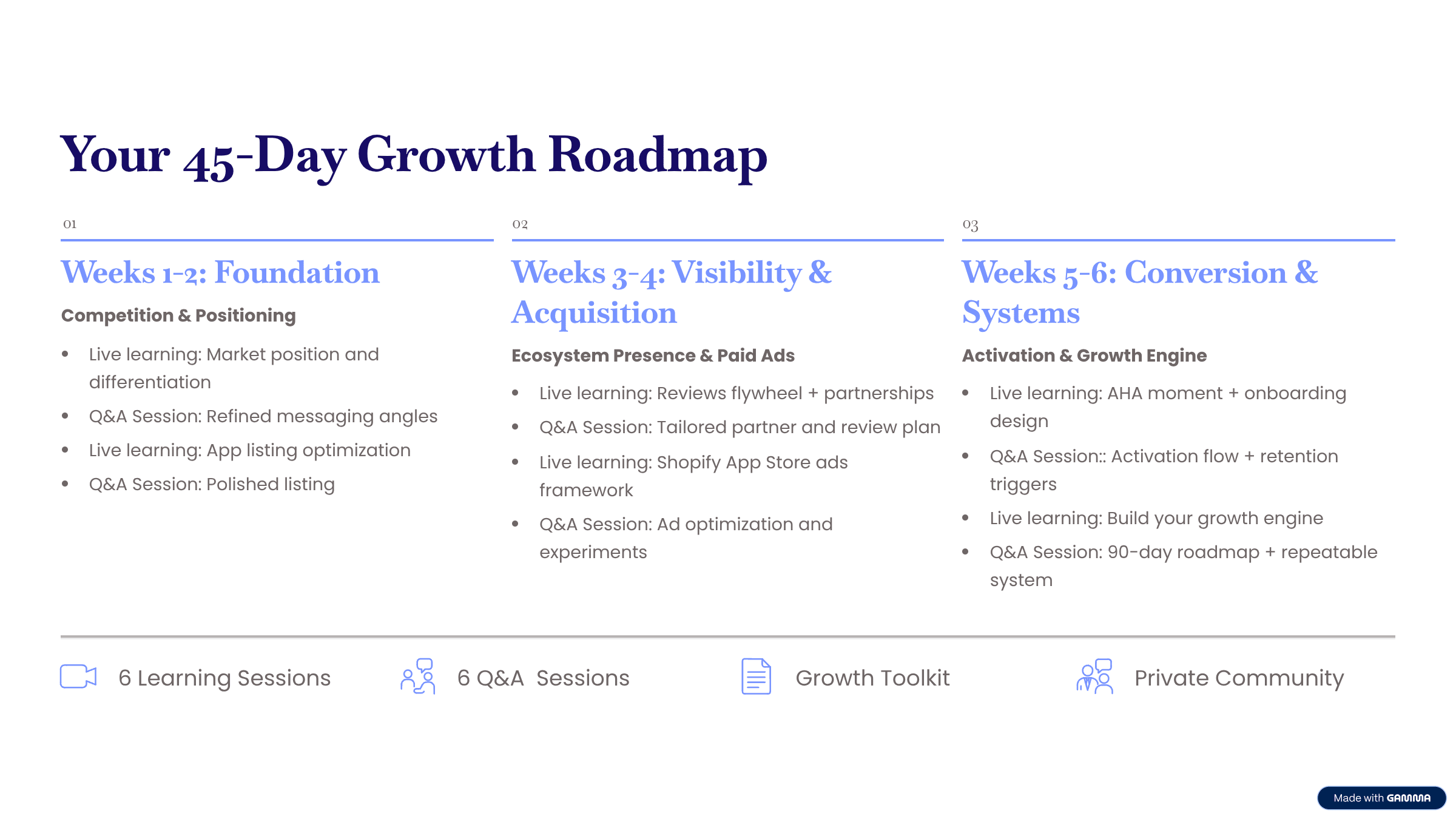 A 45-day cohort program designed for Shopify apps to help them move from scattered efforts to clear, repeatable growth decisions. Starts on January 26th | Limited to 10 Apps | Only $1.500